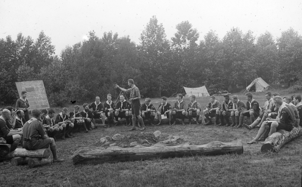 Midden: Jan Schaap (staand) met deelnemers van de Gilwell training in de 'praatcirkel' op Leidersveld 1