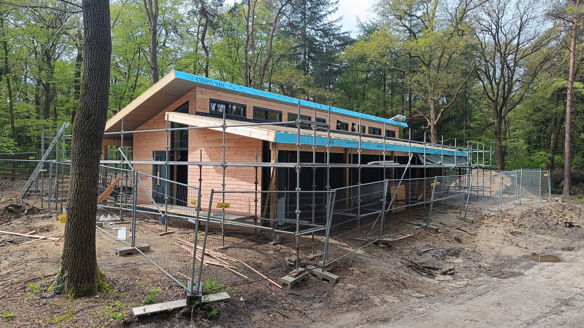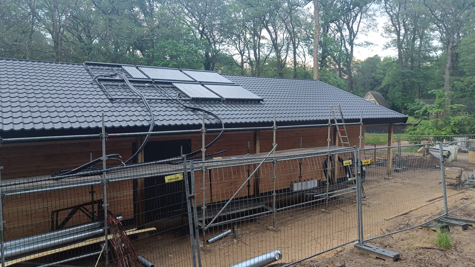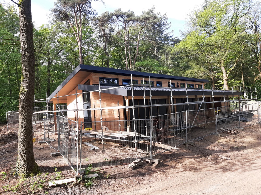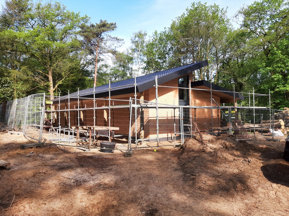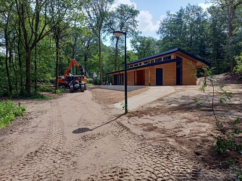 28 en 29 mei: De leidingen worden aangelegd. Het lijkt een ravage, maar nadat de leidingen in de grond liggen zie je er (bijna) niets meer van. Nu de bouwhekken weg zijn, ziet het nieuwe gebouw er al fraai uit. Het hout wordt niet geschilderd, en is dus een andere kleurstelling dan de banner aangeeft. Dit is veel mooier en past prima bij de andere gebouwen. Toch? Nu verder de binnenkant nog.