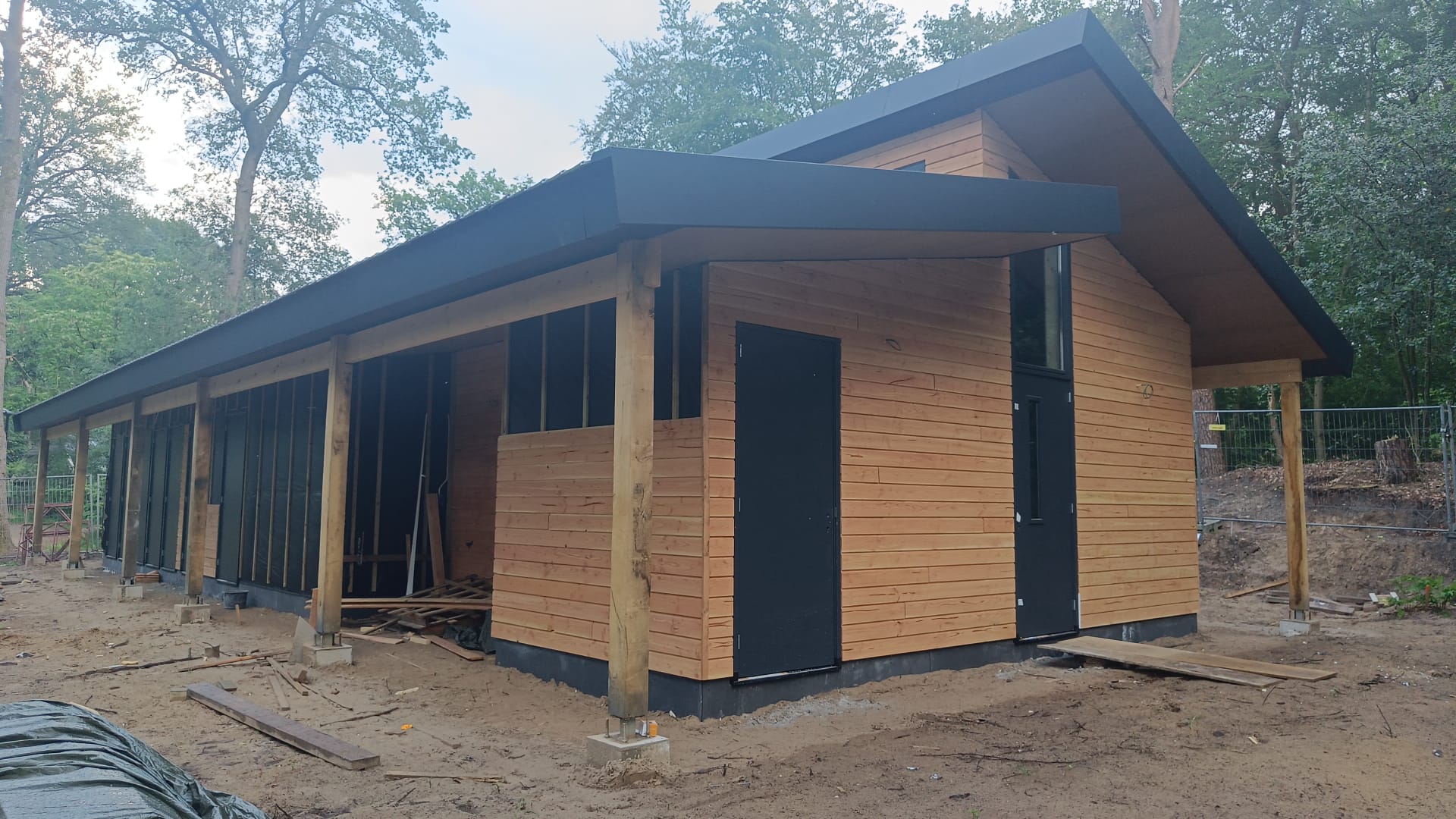 De houten steunpalen rondom het gebouw komen van eigen bomen van Ada’s Hoeve!