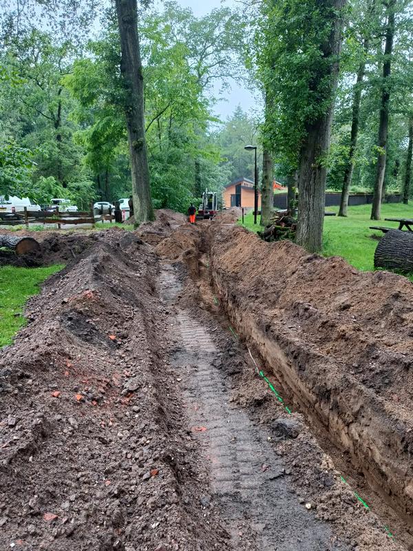 De leidingen zijn ingegraven. Nu wordt alles weer netjes bijgewerkt door Fons Niens.