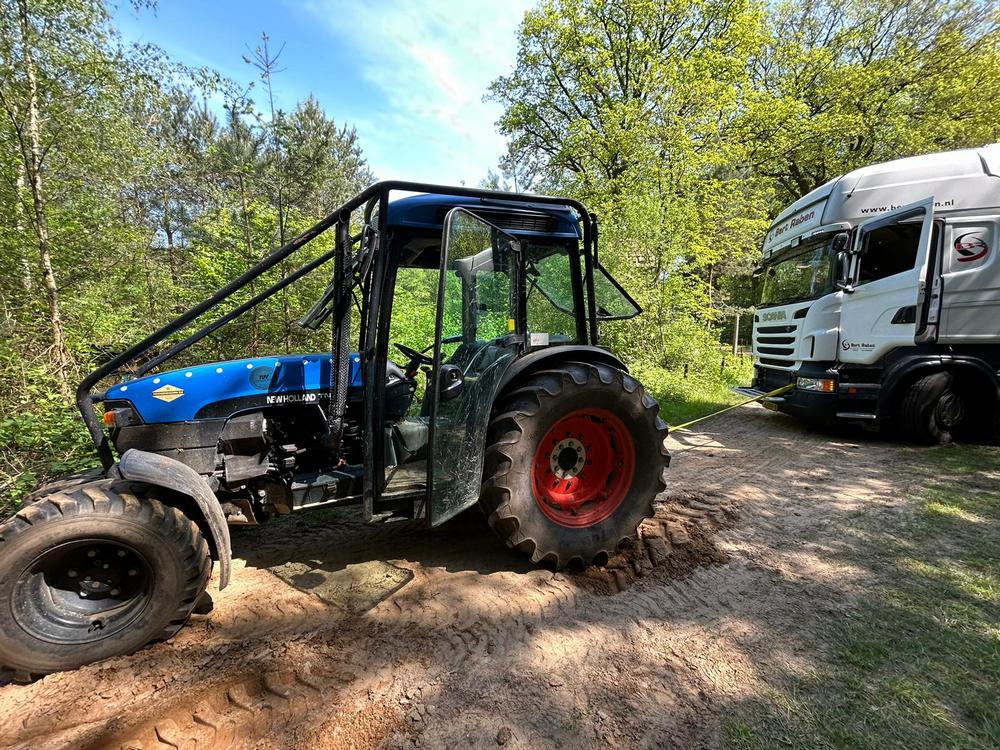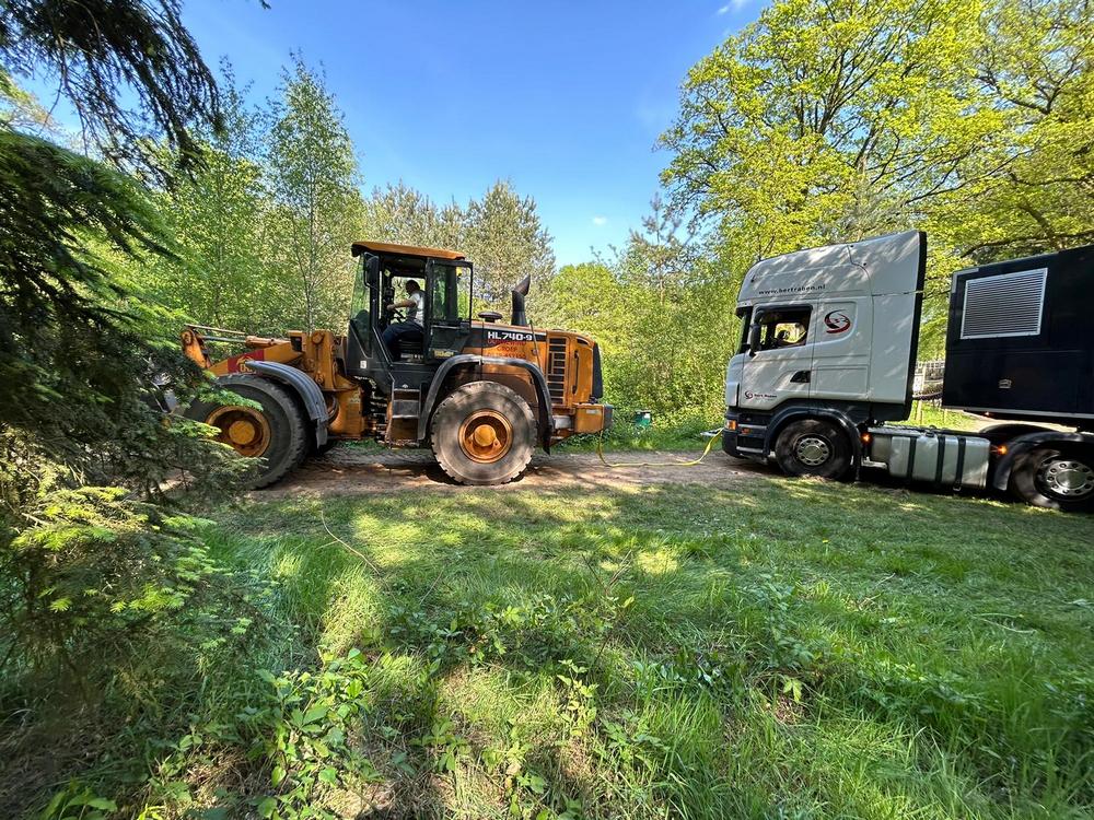 En soms gaat er iets fout. De vrachtwagenchauffeur die de afwerkvloer kwam storten dacht dat hij wel even kon keren met zijn vrachtwagen voor Jambo. Helaas compleet vastgereden/ingegraven. Eerst een poging met de trekker gedaan. Maar er moest toch zwaarder geschut komen. Een shovel moest de oplossing zijn maar die kreeg hem ook niet van zijn plek. Een kraan heeft hem vervolgens los getrokken met wat duw hulp van de shovel. Daarna het pad weer keurig hersteld.