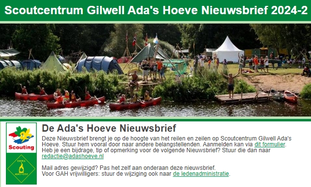 'Vrienden van Scoutcentrum Gilwell Ada's Hoeve' ontvangen circa 4x per jaar de digitale nieuwsbrief en blijven zo op de hoogte van het reilen en zeilen van ons prachtige terrein, het beheer en gebruik daarvan.