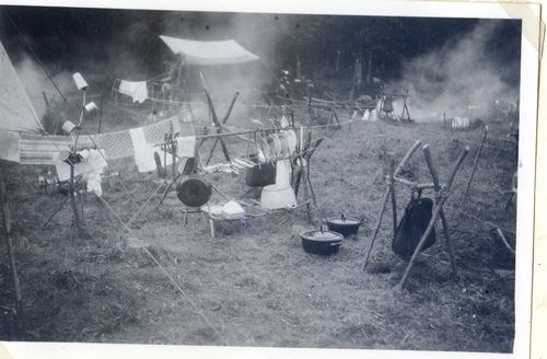 Westelijk van de vlaggenmast was een mooie kampvuurcirkel met banken gemaakt van boomstammen en een stoel voor de Deputy Camp Chief, de DCC, herkenbaar aan een Woodbadge met vier in plaats van twee kralen en een blauwe pluim op de hoed. Achter de kampvuurcirkel lag de „stores? die gebruikt werd door de staf en als op-slagplaats voor materiaal, zoals pioniertouw. De stores had een afdak zodat je er droog bleef als het regende. Het terrein had in die tijd nog geen waterleiding en ook geen sanitaire voorzieningen. Water kwam uit een pomp en de groepen die er kampeerden groeven een latrine en afvalkuilen. Water kwam uit een pomp, die aan de Zuidkant van het veld geslagen was, tegenover de vlaggenmast.