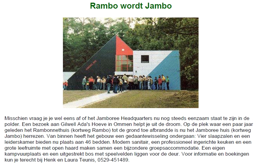 Artikel in Scouting Magazine over de opening van het Jamboreehuis nadat het Rambonnethuis enkele jaren eerder was afgebrand.